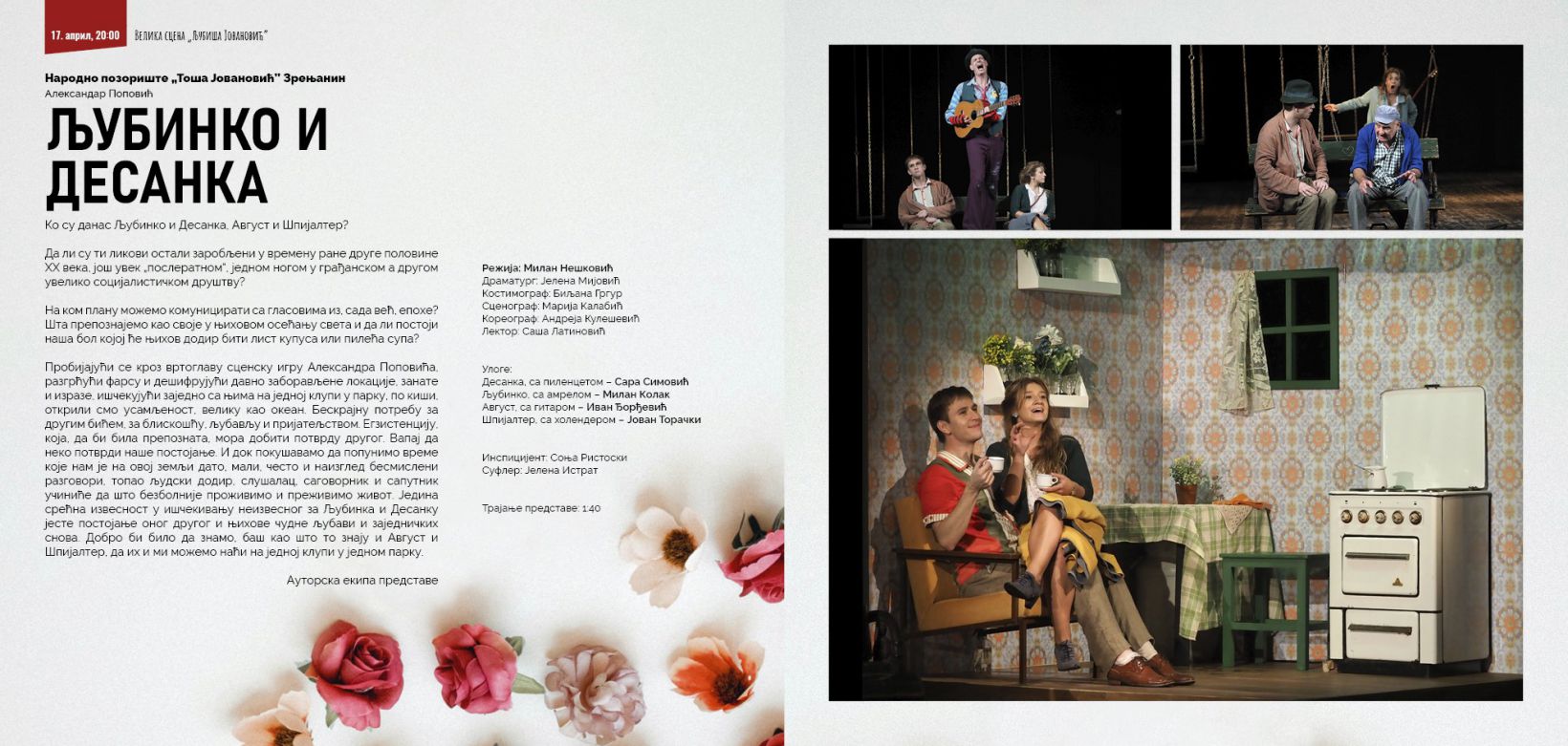 Кроз вртоглаву сценску игру глумачки тандем Сара Симовић и Милан Колак у новом читању култног комада Александра Поповића "Љубинко и Десанка" (у режији Милана Нешковића) сасвим аутентични у надахнутој игри и са свежим сценским средствима показали су савршен спој два јединствена глумачка дара и зато наша награда